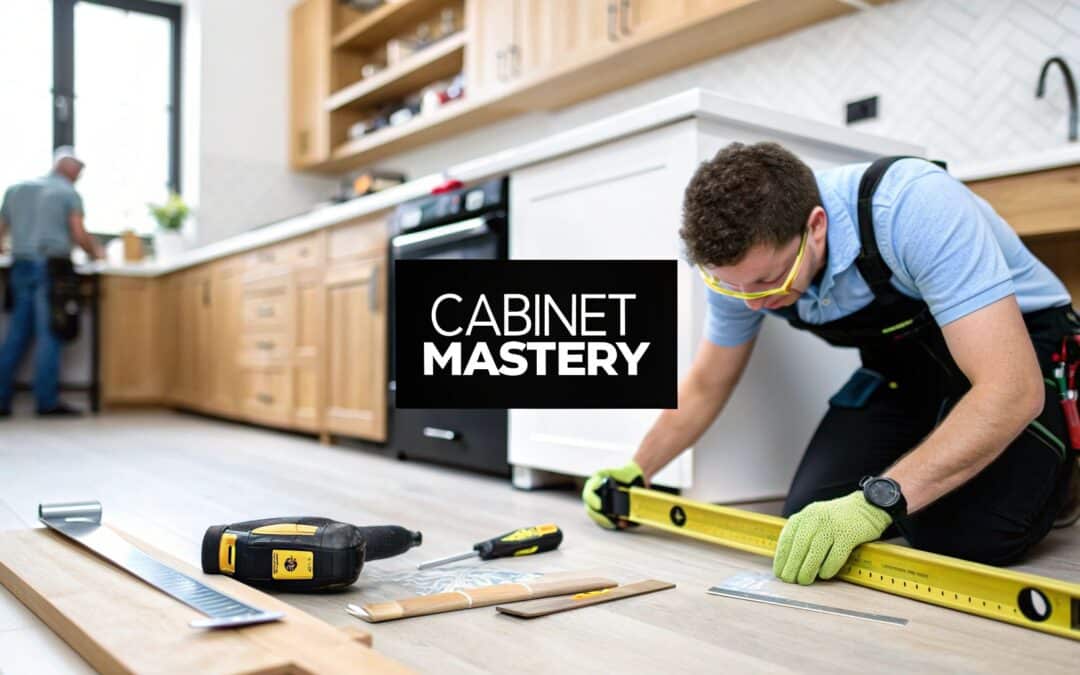 The very first thing a seasoned installer does is find the highest point on your floor. Since floors are almost never perfectly level, this becomes the reference point for everything else. This single step is what ensures all your base cabinets will line up flawlessly, creating a clean, uniform foundation for your countertops.